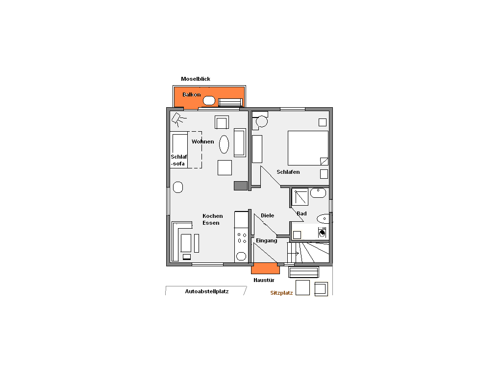 Die Ferienwohnung liegt in der Moselstraße am Ortsrand von Burg, ist 60 qm groß und bietet Platz für 2 bis 4 Personen. Sie liegt ebenerdig, hat ein Schlafzimmer mit Doppelbett und ein Wohnraum mit Schlafmöglichkeit für weitere 2 Personen. Im Wohnraum befinden sich die Küchenzeile und der Essplatz. Auf dem moselseitigen Balkon ist eine kleine Grillstelle. Der Sitzplatz vor der Haustür eignet sich hervorragend für gesellige Dämmerschoppen.
